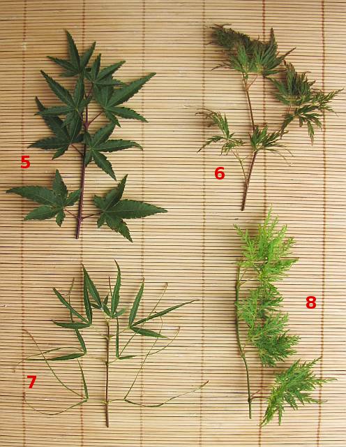 5 : Acer p. 'Little Princess' (syn. 'Mapi-No-Machi-hime') 6 : Acer p. 'Seyriu' 7 : Acer p. 'Koto-no-ito' 8 : Acer p. 'Emerald Lace'